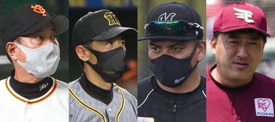 巨人・原辰徳監督、阪神・矢野燿大監督、ロッテ・井口資仁監督、楽天・石井一久監督(左から)【写真:荒川祐史】