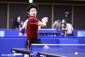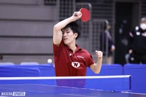 前日に行われた2回戦をフルゲームで勝ち上がった柏竹琉(スポ2=JOCエリートアカデミー)は、吉田勝紀(関西学院)との3回戦に臨む。後がない状態で迎えた3ゲーム目にデュースに持ち込む粘りを見せたが、このゲームを10-12で落とし敗戦した。一方、岩永宜久(スポ3=福島・帝京安積)、川上尚也(スポ4=静岡学園)はそれぞれ3-1、3-2で勝利し、4回戦に進出した。
