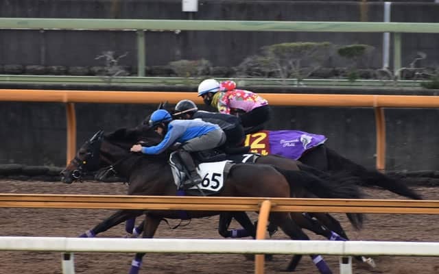 最後の直線は最内。ラスト1F標識手前ではきっちりと前に追いついて、ゴール前は3頭での追い比べ。楽な手応えで真ん中ダンテスヴューには先着、外アドマイヤポラリスと同入でのフィニッシュとなった。