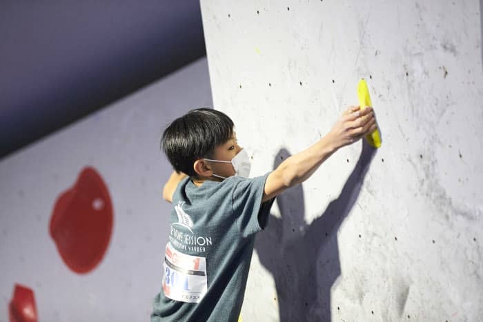 6人中4人を女子が占めた小学3・4年生男女混合では、全8完登で予選1位だった4年生の玉城陽南美(たましろ・ひなみ)が第1、第2課題を一撃すると、長いリーチを生かして完登者ゼロの第3課題も登り切ることに成功。ランジ後の身体の振られにも動じない強さを見せる玉城は、第4課題こそ完登とはならなかったものの唯一ゴール取りに迫るなどして3完登4ゾーンでフィニッシュ。昨年8歳にして岩場の三段課題を完登したという濱田琉碧(はまだ・るい)らを抑えての戴冠となった。