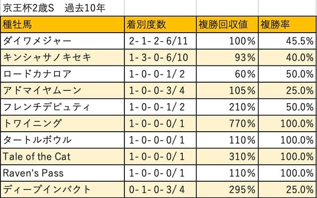 ダイワメジャー産駒は[2-1-2-6]。これまでに11頭が出走しながら複勝率は45.5%と優秀な数値を記録しており、昨年も小倉2歳S・2着からの臨戦でモントライゼが勝利をつかんでいた。なお、産駒出走機会がありながら馬券に絡めなかった年は19年の一度しかなく、そのときもグランチェイサーが3着とはクビ差の4着で入線している。今年は上位人気と目されるコラリンが該当。