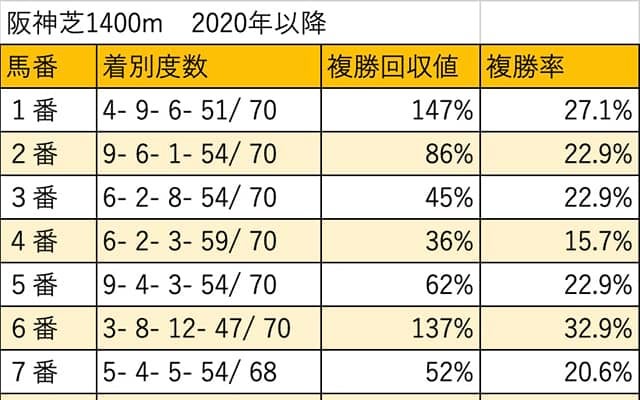 6日に阪神競馬場で行われるファンタジーS(2歳・牝・GIII・芝1400m)について枠順・馬番別に検証していく。なお、今年は開催日割の変更に伴い阪神芝1400mにて施行されるため、2020年以降の当該コース成績をデータの集計対象とした。