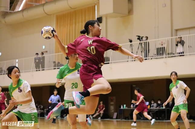 2年ぶりの全日本学生選手権(インカレ)が開幕した。この1年の集大成であるインカレ、初戦の相手は東海地区の強豪校である東学大。試合序盤から相手の猛攻を受け、4点を連取されてしまう。東学大が屈強なフィジカルで突破し得点を積み重ねるのに対し、早大はなかなかセットオフェンスが決まらない。これにより逆速攻からのゴールを許し、前半を5点ビハインドで終える。後半が始まると早大はディフェンスシステムを0-6ディフェンスから1-5ディフェンスに変更し、運動量の向上を図る。しかし、オフェンスでのミスから逆速攻を許し最大8点差まで広げられる。ここで終われない早大は4年生を中心に積極的なディフェンスから相手のミスを誘い、LW木村百花(スポ1=東京・白梅学園)のサイドシュートを含む5連続得点で追い上げ、LB浦野詩織(スポ2=愛知・旭丘)の3連続得点で逆転。死力を尽くした熱戦は最終スコア28―27で早大は劇的な逆転勝利を収めた。