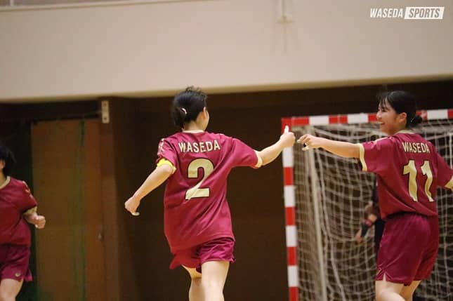 何としても東学大のオフェンスを止めたい早大は、PV紅林詩乃主将(スポ4=東京・佼成学園女)をトップに置く1-5ディフェンスに切り換える。序盤は豊富な運動量で相手のミスを誘いオフェンスにつなげるが、シュートが入らず得点することができない。徐々に東学大が早大の立体的なディフェンスに順応していき、4連続得点で早大を突き放す。早大ベンチはタイムアウトを要求し、プレーの修正を図る。「ディフェンスで守らないといくら点を取っても縮まらない」(紅林)という声掛けのもとディフェンスからリズムを作り、紅林主将のこの日初得点となるポストシュートをきっかけに連続得点で追い上げる。東学大フローターのロングシュートで1点を失うが、絶好調の青木が速攻にサイドシュートと得点を積み重ね、後半19分過ぎにRB阿部美幸(スポ4=東京・佼成学園女)の速攻でついに同点に追いつく。一進一退の攻防の末、GK川村夏希(スポ2=東京・佼成学園女)の好セーブで一気に流れを引き寄せ、紅林主将の気迫のこもったプレーが相手選手の反則を誘い、ペナルティースローを獲得。このチャンスを任されたのはチーム最多の7得点を記録した浦野。チーム全員からの声援を背に受け放たれたボールは、豪快に相手ゴールに突き刺さり、後半26分ついに逆転。追い上げムードの中、紅林主将のポストシュートで連続得点し、勝利を呼び寄せる。最後には東学大が意地を見せ、追い上げられる展開となるが、2失点で切り抜け試合終了。チーム一丸となって望んだ2年ぶりのインカレは劇的な逆転で初戦突破となった。