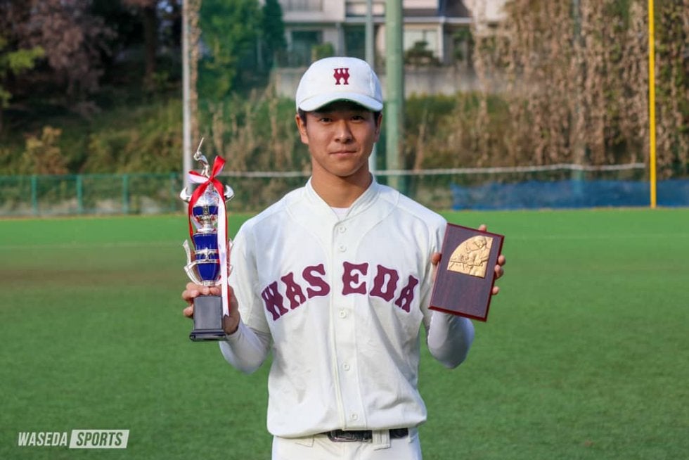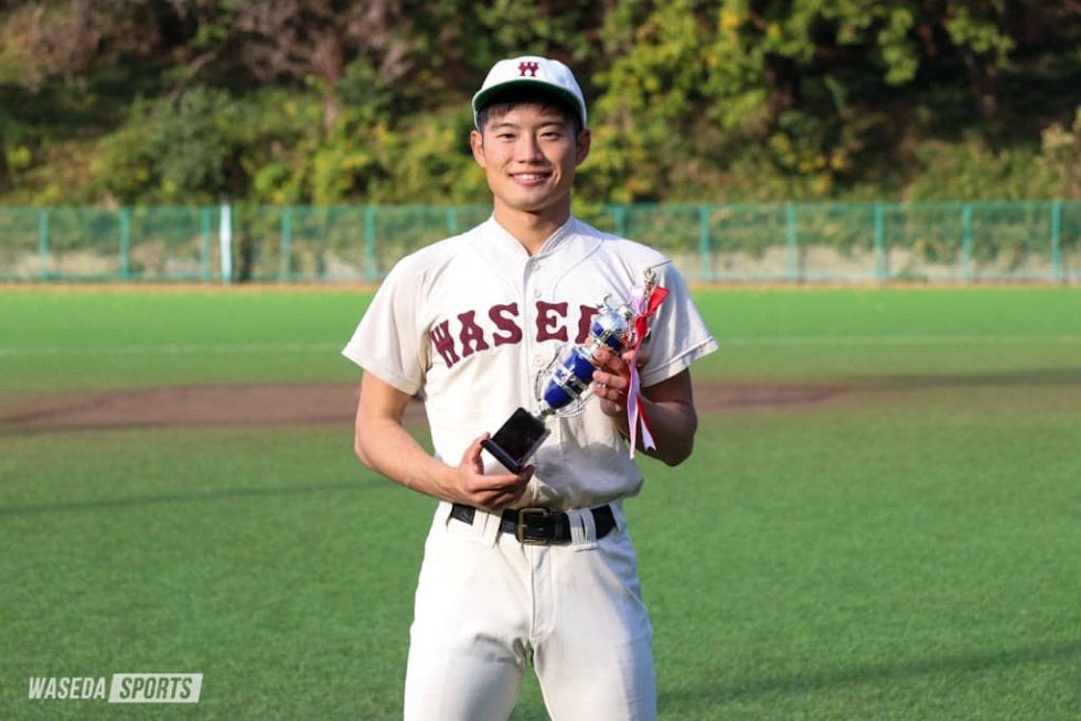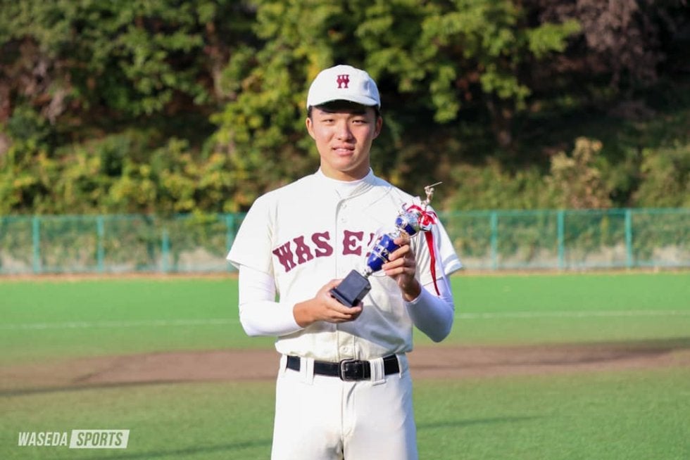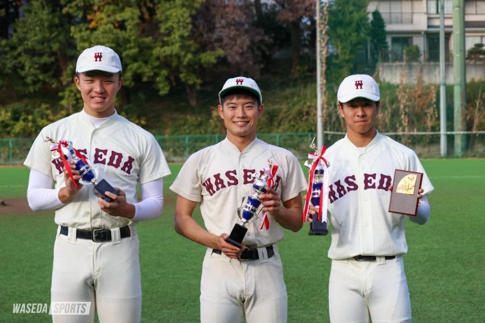 11月7日、東京六大学秋季リーグ戦(秋季リーグ戦)の閉会式が開催され、9月上旬から約2カ月間に渡って行われた秋季リーグ戦もこれで閉幕となった。また、秋季リーグ戦の各個人賞受賞者も発表され、早大からは渡部椋雅主将(商4=神奈川・桐光学園)と川原崚(商3=東京・早実)がベストナインを、鈴木勇介(教2=東京・桐朋)が最優秀審判賞を受賞した。さらに、閉会式が中止となった東京六大学春季リーグ戦(春季リーグ戦)の個人賞表彰も同時に行われ、春季リーグ戦でベストナインに輝いた清水佑樹(スポ4=早稲田佐賀)と新井健太(商3=東京・早大学院)が表彰を受けた。なお、新井はでサイクル安打を達成したため、ベストナインと同時に特別賞の表彰も受けた。