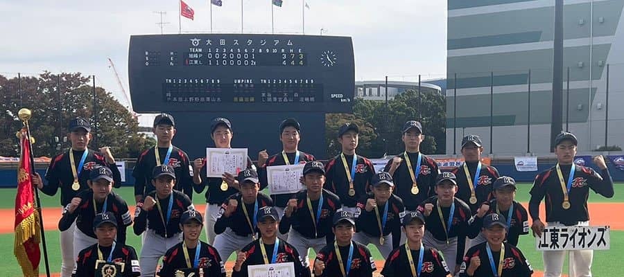 ポニーリーグの関東秋季コルト選手権大会で優勝した江東ライオンズ【写真:川村虎大】