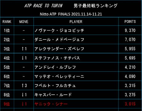 また、最終戦ランキングで9位に位置しているJ・シナー(イタリア)は今週開催されているストックホルム・オープン(スウェーデン/ストックホルム、室内ハード、ATP250)に第1シードとして出場中だが、仮に優勝した場合でも250ポイントの加算にとどまるため、同8位のルードを抜くことができないことが決まっている。