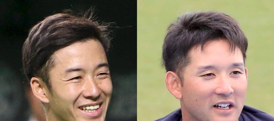 今季限りで現役を引退した斎藤佑樹氏(左)と杉谷拳士【写真:石川加奈子】