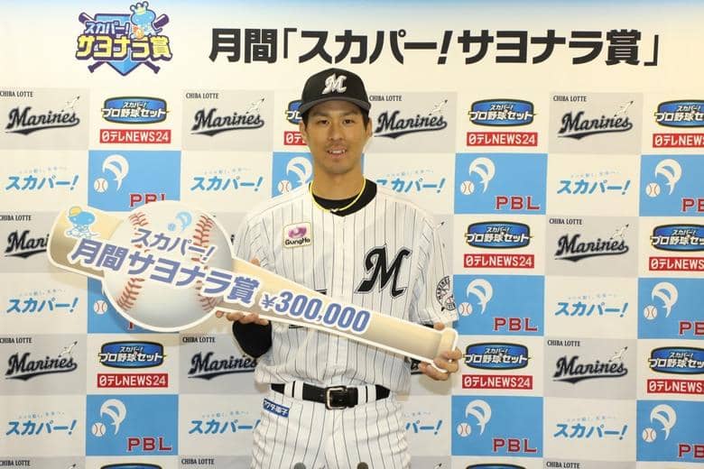 パ・リーグ 千葉ロッテマリーンズ 岡大海選手が、10,11月度の「スカパー!サヨナラ賞」を受賞した。この賞は、その月の全サヨナラ試合の中で、最も劇的なサヨナラ打を放った選手を称えたもの。