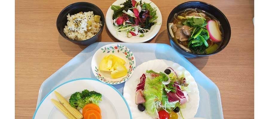 この日の埼玉パナソニックワイルドナイツのランチメニュー。左下が大豆ミートハンバーグ。ソースはデミグラスソースと大根おろしポン酢を用意。ほか、サツマイモご飯、鴨肉そば、野菜のナムル、2種類のサラダ、パイナップル