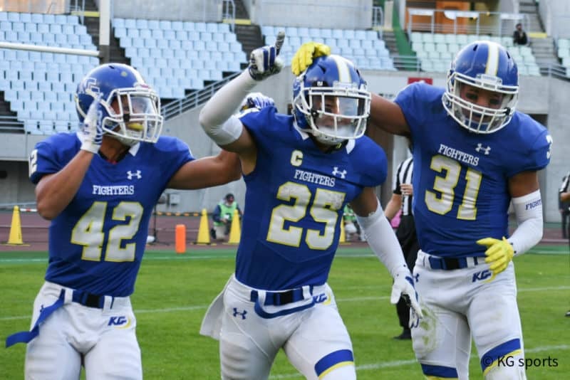 11月14日、ヤンマースタジアム長居にて関学は立命大と対戦。28-25で勝利し、関西リーグ優勝を飾った。 関学のキックで試合開始。立命大の投じたボールを#23DB和泉(経4)がインターセプトし、攻撃へと移った。第1クオーター(Q)残り1分36秒で#26RB前田(社4)がエンドゾーンへボールを持ち込み、タッチダウン(TD)。#16K永田(法4)のキックも成功し、先制点を獲得した。第2Qでは、立命大の攻撃を止め切れず、ゴール前44ヤードまで前進されるとフィールドゴール(FG)で3点の獲得を許した。関学も#7WR前島(社2)から#80WR戸田(経4)へのパスが成功し、すかさず得点。14ー3と点差を広げた。しかし、立命大も譲らずロングパスを通し、TD。2ポイントコンバージョンも成功させ14ー11と接戦に持ち込まれ前半を終えた。第3Qでは、立命大の投じたロングパスを#25DB竹原(社4)がインターセプト。攻守交代するも、長くは続かず。再びディフェンスに移るとゴール前9ヤードまで前進を許し、関学の反則もありそのままTD。14ー18で逆転され第4Qを迎えた。勝負が決まる最終Qでは、開始早々#26RB前田が27ヤードを走り切りTD。その後もランプレーを重ね、#27RB齋藤(総4)が追加点を挙げた。ディフェンスでは、#25DB竹原が自身2度目のインターセプトを決め、会場を沸かせた。しかし、立命大も意地を見せ再びTD。28ー25と正念場が続くも、関学が守り切りそのまま試合終了。58回目の関西学生リーグ優勝を果たした。 次戦は12月5日、ヨドコウ桜スタジアムにて西日本決勝戦に臨む。