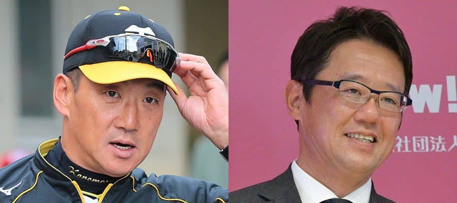 2018年まで阪神の監督を務めた金本知憲氏(左)とヤクルトで活躍した古田敦也氏【写真:荒川祐史、上野明洸】