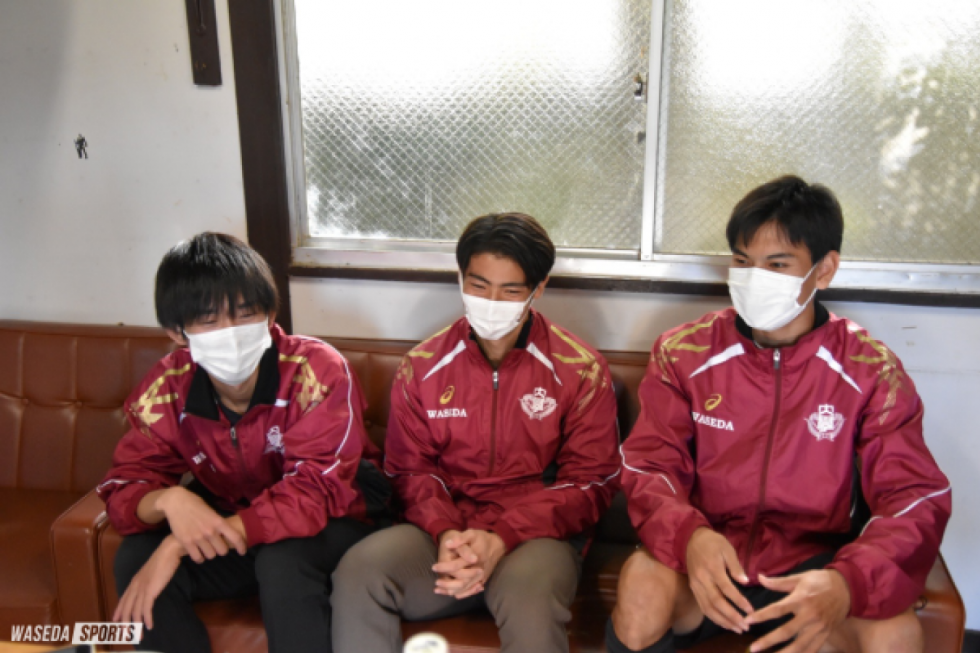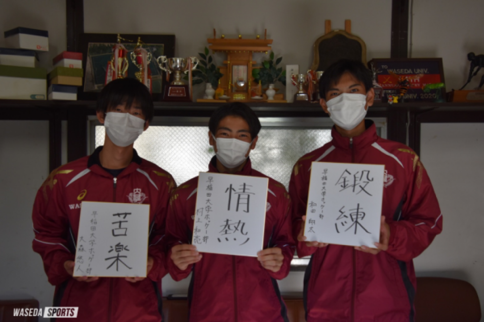 いよいよ21日に迫った早慶戦。今回は4年生として最後の早慶戦を迎えるFW村上和亮主将(政経4=東京・早大学院)、MF大森悠人(政経4=東京・早大学院)FW和田翔太(教育4=東京・早大学院)の3人にお話を伺った。今季慶応には秋季リーグで0ー1で敗れている。ホッケー生活の集大成となる一戦を前に、4年生は何を語るのか。
