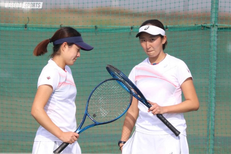 押川・吉岡組は第1セット、最後の2ゲームで互いのストロークから積極的にポーチボレーなども決め、7-5で獲得する。第2セットは思うように攻撃がかみ合わず、勝負は第3セットへ。中盤に大きくリードしてそのまま勝利するかと思われたが、最後の1ポイントがなかなか取りきれず苦しい時間が続く。それでも9-9からなんとか取りきり、接戦をものにした。石川・齋藤優寧(スポ1=岡山学芸館)組は1回戦に続き、相手を圧倒。大差でストレート勝ちを収めた。渡邉優夢(社1=兵庫・相生学院)・足立理帆(社3=埼玉・山村学園)組は1回戦に引き続き明るい雰囲気でプレー。第2セット中盤から粘り強さが相手のミスを誘い、前でも積極的に動いて流れに乗り、第3セットへ持ち込む。第3セットは4-2とリードしたが、そこから甘くなった球を決められるポイントが続き惜しくも勝利とはならなかった。