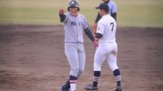 11月19日(金)大学野球オータムフレッシュリーグin静岡 中京大戦 @草薙球場適時打を放ち塁上で喜ぶ清原慶大のオータム…
