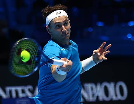 男子テニス最終戦のNitto ATPファイナルズ(イタリア/トリノ、室内ハード)は大会6日目の19日、シングルスの予選ラウンドロビン「グリーングループ」の第3戦が行われ、第8シードのC・ルード(ノルウェー)が第5シードA・ルブレフ(ロシア)をの2-6,7-5,7-6 (7-5)の逆転で破り、大会初の決勝トーナメント進出を決めた。