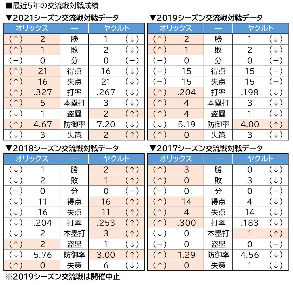 第1、2戦の舞台となる京セラドームでの今季の両チームの対戦では、オリックスが2勝1敗と勝ち越した。その交流戦で、オリックスは山本と田嶋が先発しており、山本は7回2失点で勝ち投手となり、田嶋は5回6失点で負け投手になっている。ヤクルトの奥川と高橋は登板していないが、シリーズでもブルペン要員となりそうなスアレスが先発し、4回途中5失点で降板している。