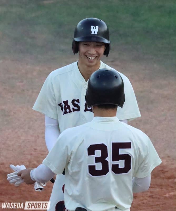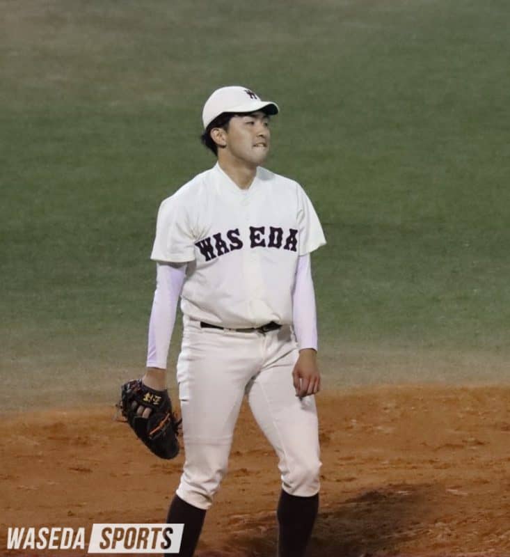 1試合目の先発を任されたのは澤村栄太郎(スポ2=早稲田佐賀)。澤村はいきなり先頭打者の森谷凌(2年)に二塁打を許す。2番・平本海人(2年)を三振に抑えるが、失策が絡み2死一、三塁のピンチを招く。ここで迎えた5番・後藤維吹(1年)に右中間を破る走者一掃適時二塁打を打たれ、立ち上がりに2失点を喫する。続く2回も制球が定まらないが、粘り強い投球で三者凡退に打ち取る。しかし、3回も苦しい投球が続く。先頭打者に四球で出塁を許すと、その後も制球が安定せず、先ほどのピンチと同様に2死一、三塁で5番・後藤維吹を迎える。1ボール、2ストライクの4球目をレフトに運ばれ、澤村は3回3失点でマウンドを後にした。澤村に代わって登板した菊池笙太郎(教1=東京・早実)は打者を二ゴロに打ち取り、切り抜ける。その後も菊池は6回まで無失点の好投。菊池の好投に応えたい早大打線は4回裏、5番・梅村大和(教1=東京・早実)が右前安打で出塁すると、6番・栗田勇雅(スポ1=山梨学院)がレフトポール際に本塁打を放ち2点を返す。しかし、7回に満塁本塁打で4点を失い、最終回に1点を返すも反撃及ばず、3ー7で敗戦となった。