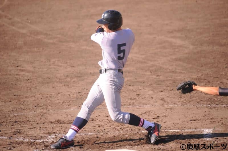 2戦連続安打と好調の吉川試合が動いたのは6回表、東海大海洋に1死から出塁されると、暴投などで三塁まで塁を進められる。ここを抑えたかった梶谷だったが、4番・岡崎元貴(1年・岩倉)に安打を浴び、追加点を許す。しかしその裏、無死で代打・吉川海斗(法2・慶應)が左翼への安打で出塁し、さらに盗塁成功で無死二塁とする。久しぶりに得点圏に走者を進めた慶大は、続く古野が球を捉え2点目とし、試合を再び振り出しに戻した。盗塁を決め2死二塁と更なるチャンスを迎えるが、追加点とはならなかった。