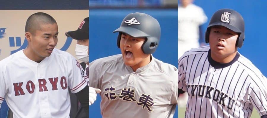 広陵・真鍋慧、花巻東・佐々木麟太郎、九州国際大付・佐倉侠史朗(左から)【写真:荒川祐史】