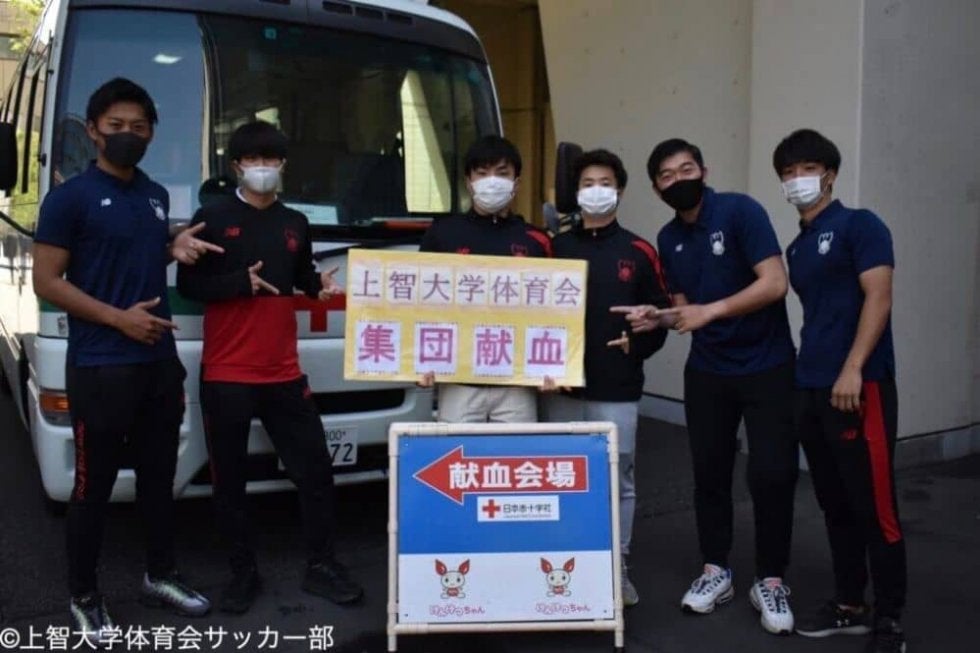 上智大学体育会サッカー部は、大学の他体育会とともに集団献血を実施しています。運営を主に担当しているのは、チーム内の企画課ボランティア部門。「ボランティア部の部員が『コロナ禍で献血をしてくれる人が減っている』というニュースについて教えてくれて、部として何かできないかと考え始めたのが発端でした」取組の中心にいる学生トレーナーの田崎隼太郎さんが経緯を話します。