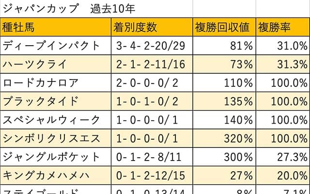 過去10年で最多となる9回の馬券絡みがディープインパクト。次点で5回のハーツクライが続き、3回がジャングルポケット、キングカメハメハとなっている。