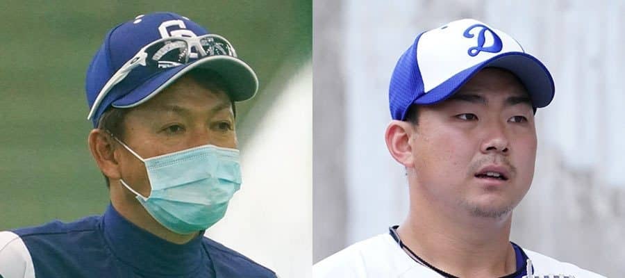 中日・立浪和義監督(左)と小笠原慎之介【写真:荒川祐史】
