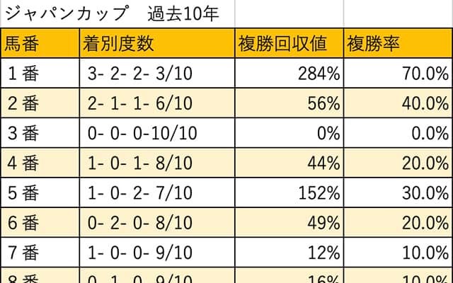28日に東京競馬場で行われるジャパンC(3歳上・GI・芝2400m)について枠順・馬番別に検証していく。
