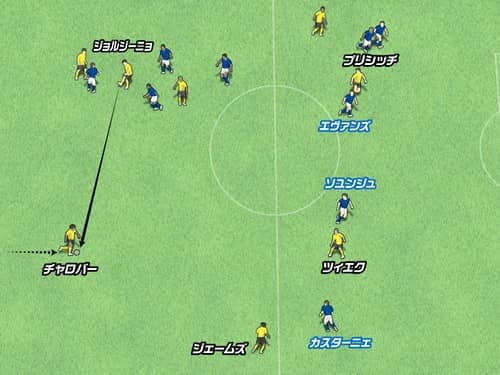 チャロバーは前線の状況を見ながら、素早く前のスペースへのドリブルを選択し、まず相手の前線、中盤という2ラインを一気に突破した。さらに前の数的同数の局面に進入したことで、チェルシーが3対2で数的優位となった。ここがチャロバーの選択が効果的だったところだ。
