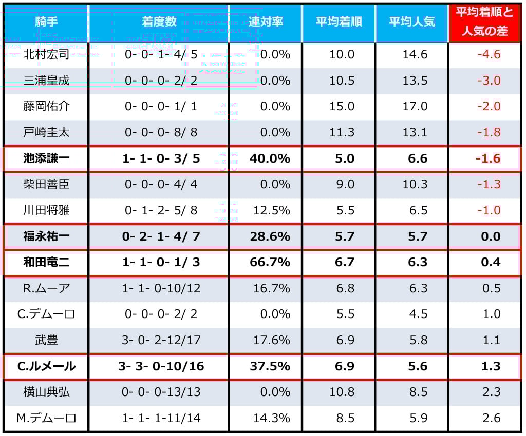 ・1、2番人気騎乗時【3-3-0-1】連対率85.7% ・5番人気以下騎乗時【0-0-0-9】連対率0%