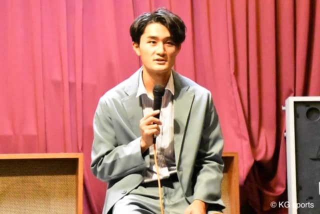 <写真・壇上で質問に答える森田> 11月27日、神戸市高砂ビル100banスタジオ503室にて棒高跳の森田凌世(総4)が…