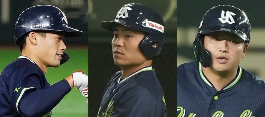 ヤクルト・塩見泰隆、中村悠平、村上宗隆(左から)【写真:荒川祐史】
