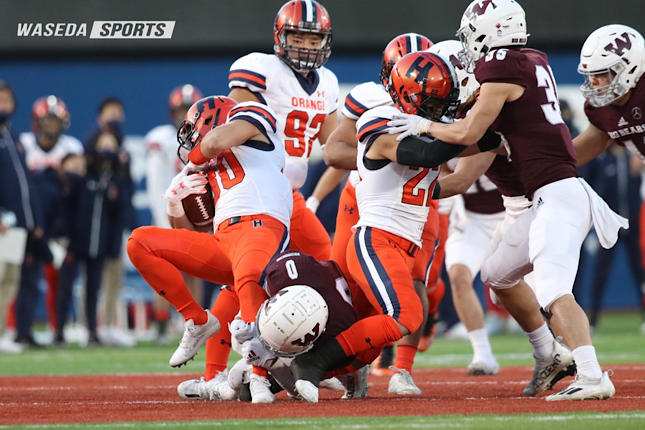 関東大学秋季リーグ戦のグループリーグで3連勝した早大BIG BEARSは、2年ぶりの関東制覇をかけて法大と対戦した。法大は強力なオフェンスが持ち味で、今シーズンは1試合平均で400ヤードを稼いでいる。一方早大は、平均失点が8.7点と安定した守備が持ち味だ。互いに強みをどこまで発揮できるかが鍵となったこの一戦。前半はオフェンス・ディフェンス共に法大に苦戦を強いられ、0-17で前半を折り返す。後半は、最初のドライブで早大オフェンスがTDを決め、第4クオーター(Q)にはFGを成功させ、7点差まで追い上げる。しかし、法大に追加点を奪われ惜しくも10-24で敗れ、関東2位でシーズンを終えた。