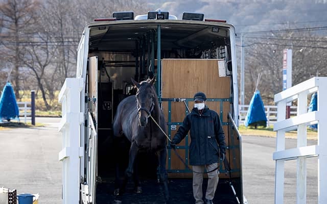 種牡馬入りのワールドプレミアが優駿スタリオンステーションに到着