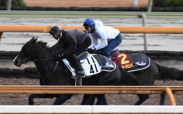 武豊騎手を背に追い切ったウォーターナビレラ(写真奥、撮影:井内利彰)