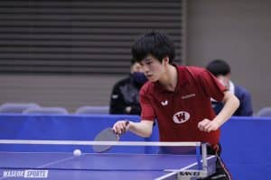 開幕戦の1番で登場したのは杉本和也(スポ2=福岡・希望が丘)。序盤から点の取り合いとなったが、勝負どころでラリーを制しチーム1勝目を持ち帰った。さらに2番の柏竹琉(スポ2=JOCエリートアカデミー)も両ハンドのドライブを駆使して得点を重ねて相手を突き放す。杉本に続き2試合連続となるストレート勝ちを収めチームを勢い付けた。3番の松本累(商3=東京・早実)が敗れ、2勝1敗で出番を迎えたのは岩永宜久主将(スポ3=福島・帝京安積)・杉本組。第1、第2ゲームをものにし、このままストレートで勝利するかと思われた。しかし相手ペアも譲らず「後半は自分たちの苦手なところを突かれてしまった」(岩永)と、2ゲームを取り返され苦しい展開に。最終ゲームも悪い流れを断ち切れず、最後は空いたスペースを打ち抜かれ、万事休す。その後、5番の荒井和也(スポ1=福岡・希望が丘)もフルゲームの末に敗れ、2勝3敗とチームは窮地に。6番の岩永が貫禄のストレート勝ちで7番の宮木宏輔(商3=京都・東山)つなぐいだが、宮木が相手の強打に押し込まれるかたちで敗戦。3勝4敗で、日体大にあと一歩及ばなかった。