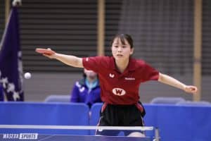 一方、女子は序盤のシングルスで苦戦を強いられた。1番の顧琳婧(スポ1=愛知・桜丘)が相手の強打に押されゲームカウント1―3で敗戦。続く2番の里川奈優(スポ2=高知・明徳義塾)は、相手カットマンに対してツッツキからチャンスで強打し得点を重ねたが、試合が進むにつれ攻撃のミスを多発。ゲームカウント1-2で迎えた第4ゲームで促進ルールが適用されると、攻め手を欠いた里川が7連続で失点し、3ゲーム目を献上した。チームが0勝2敗と苦しい場面で出番を迎えたのが、黒野葵衣主将(スポ3=東京・武蔵野)。強みの変化に富んだカット打ちで相手のネットミスを誘い、ストレート勝ちを収め、主将自ら、貴重なチーム1勝目を挙げた。その後のダブルスも勝利し、勝負を振り出しに戻すと、後半のシングルス1人目で福岡乃愛(スポ1=兵庫・三田学園)が登場。相手のエース格に当たり「自分から向かって行くという気持ちで入った」(福岡)。ゲームカウント1-2と追い込まれたが、接戦でも「相手の焦りを見て自分の作戦を立てることができた」と福岡。カットマンでは珍しい裏裏ラバーを使用しており、早い打点のバックハンドも得点源になった。第4、第5ゲームを11―9で取り返し、逆転勝利。チーム3連勝に大手をかけた。その後、6番の真鍋雅(スポ3=岡山・山陽女子)が2ゲーム先取から逆転負けを喫したが、7番の中島がゲームカウント3―1で締め、早大に軍配。3年生の黒野と中島の手堅い勝利、そして1年生の福岡の活躍で開幕戦を白星で飾った。