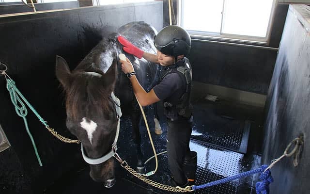▲騎乗訓練後に手入れを行う研修生の様子 (撮影:田中哲実)