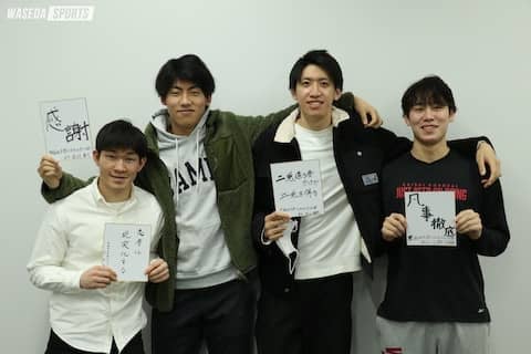 今回登場するのは、フレッシュな1年生、F小野功稀(社1=新潟・開志国際)、C松山雄亮(スポ1=京都・洛南)、C高羽優介(法1=東京・早大学院)、G杉渉夢(教1=福岡大大濠)の4人組。早稲田大学男子バスケットボール部に入部してから、早7カ月。全日本大学選手権(インカレ)を控えた今、4人は何を思うのか。早稲田を目指した理由やそれぞれの立場から見た今シーズン、そしてインカレへの思いについてうかがった。