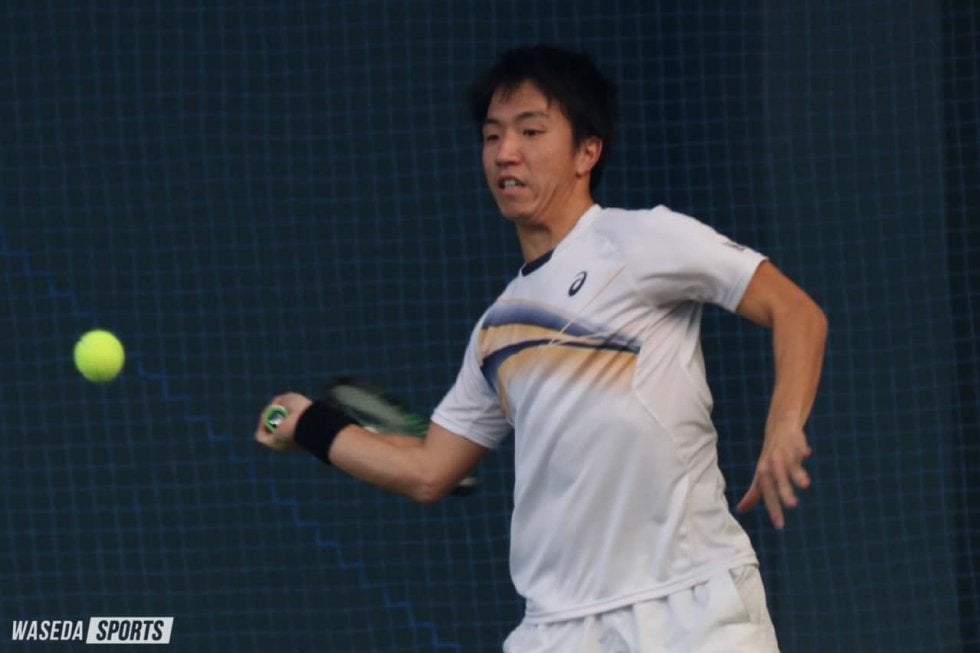 男子シングルスに出場した白石は、ここまで早大の選手を倒して勝ち上がってきた法大の中川舜祐と対戦。パワフルなショットが持ち味の相手に、緩急のついたストロークと持ち前のフットワークで応戦し、第1ゲームでブレークに成功する。相手に流れを奪われることなく、第1セットを6-2で先取した。第2セットの第1ゲームは5回以上に及ぶ長いデュースにもつれこんだが、攻守のメリハリをつけて相手のリズムを崩し、ゲームを獲得する。ここで勢いに乗り、一気に4-0までリードを広げる。相手の力強いプレーに流れを奪われかけた場面もあったが、粘り強くミスを誘い、第2セットも6-2で快勝した。