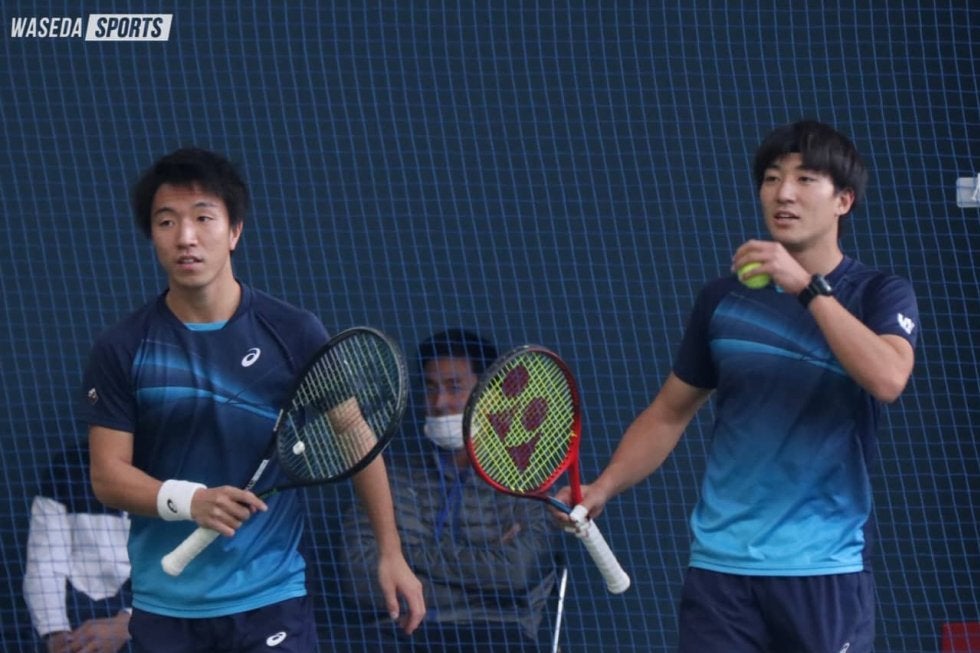 男子ダブルスに出場した丹下・白石組は、近大の田口涼太郎・河野甲斐組と対戦。序盤は相手の勢いに押され、ブレークを許すなど主導権を握られてしまう。しかし、すぐにブレークを返すと、流れを掴んで6-3で第1セットを手にする。第2セットは「完璧に近いできでプレーできた」(白石)と言うように、積極的な姿勢で相手の攻撃を封じ、6-4で勝利した。