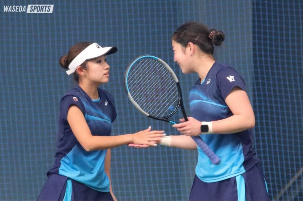 女子ダブルスは、夏の全日本学生選手権で優勝を飾った石川琴実主将(社3=神奈川・白鵬女)・吉岡希紗(スポ3=三重・四日市商)組と、勢いのある神鳥・齊藤ペアの同校対決となった。「優勝を目指していた」(石川)という石川・吉岡組は序盤、安定した連携を見せるが、試合の流れは神鳥・齊藤組に。「強気に攻めよう」と常に先に仕掛けた神鳥・齊藤組は、力強いショット、滑らせるようなロブ、パワーのあるサーブが武器の齊藤が相手を崩し、ここぞとばかりに神鳥が安定したストロークを叩き込むなど、石川・吉岡組に反撃のすきを与えない。吉岡の足の状態も芳しくなく、試合の展開は常に神鳥・齊藤組次第。結果は6-4、6-2で神鳥・齊藤組に軍配が上がった。