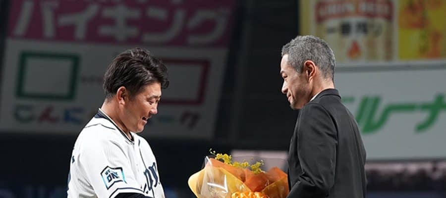 4日に行われた西武・松坂大輔の引退セレモニーに登場したイチロー氏(右)【写真:荒川祐史】