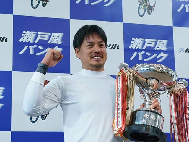 やっと獲れました。新田君が迫ってきていたので、これ以上無理というくらい気持ちを込めてハンドルを投げました。(優勝した)確信はなかったですが、3コーナのビジョンを見て、「あっ、勝っている」と。ここ最近では、(渡部)哲男さん、(松本)貴治と地元記念を優勝していたので、優勝したい気持ちを強く持っていました。初日、2日目と気持ちが空回りして、お客さんに迷惑をかけてしまいましたが、準決勝から吹っ切れて手応えもあり、今日もその通りに(自転車が)進んでくれました。貴治の仕掛けがドンピシャでかかりも良かったです。こんなに嬉しいのは初めて。今年前半、頚椎骨折のケガをして家族に心配をかけていたので、最高の形で恩返しができました。これで来年も頑張れます」