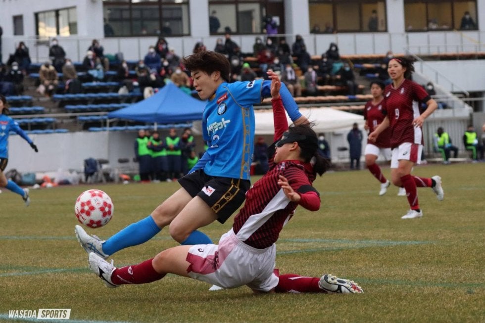 気温は6度、日差しもなく、冷たい風が吹きつける中始まった皇后杯2回戦。ア女は、前半から相手の激しいプレスに臆することなく、正面からぶつかり合う。「自分たちの特徴である、攻守の切り替えの部分では通用していた」とMFブラフ・シャーン(スポ3=スフィーダ世田谷FCユース)。中盤でのボールの奪い合いも、互角に近い戦いを繰り広げた。しかし1本にとどまった前半のシュート数が示すように、ピッチの幅を使った懸命の攻撃もゴール前まで持っていくことができない。攻撃を完結できず、逆にカウンターを食らい続ける厳しい展開となった。そして28分、ついにスコアは動く。ハーフウェーラインからさほど距離のないポイントからのFK。ファーサイドで待っていた選手にフリーでのヘディングを許し、1点を奪われる。DF加藤希主将(スポ4=アンジュヴィオレ広島)が、「まだ自分たちが話している中で蹴られた。そこの準備の速さ」と不十分だった守備を悔やんだ。戦えていた格上相手に、あるいは「経験」で上回られたのかもしれない。その後もクロスバーを直撃するミドルシュートを食らうなど、攻め込まれる時間も続いた。しかし、GK近澤澪菜(スポ3=JFAアカデミー福島)を中心とした堅守で、追加点を与えないア女。1点のビハインドを背負って前半を終える。