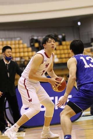 リーグ戦で課題としていた試合の出だしは、改善できていた。序盤から、「意識してインサイドを攻めようとしていました」と話す宮本のポストプレーで順調に点を取っていく。相手が宮本に対してダブルチームに来る場面では、冷静な判断で外にキックアウトして、星川やF小野功稀(社1=新潟・開志国際)のアウトサイドシュートをアシストした。さらにG土家大輝(スポ3=福岡大大濠)や星川のドライブなど、バランスの良い攻め方を見せた。ディフェンスのリバウンド保持率も高く、相手に得点のチャンスを与えない。第1Qだけで23点の大幅なリードを奪った。しかし第2Qでは、シュートが決まらず、ターンオーバーも見られた。また東海大九州に速攻から連続得点を決められ、徐々に点差を縮められる。一方、早大は土家のアウトサイドシュートと宮本のインサイドを中心に応戦し、これ以上の追い上げを許さない。第2Qは少しディフェンスに緩みが見られ、相手にリズムをつかまれる場面があった。しかし第1Qの大きなリードもあり、13点差を保って試合を折り返した。