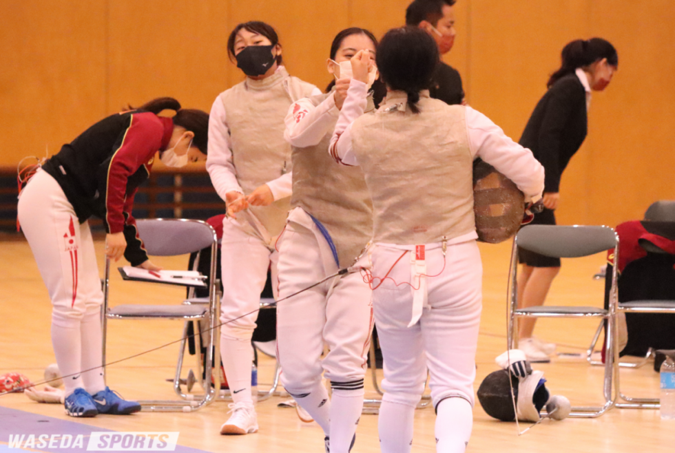 最後に行われたのは、女子フルーレ。男子フルーレの流れそのままに、終始慶大を圧倒する。全体的にポイント精度が非常に高く、4セットまでに20-2と、慶大に2点しか与えなかった。試合はその後も1日の不満を晴らすように、メンバー全員が活躍を見せ、相手に流れを渡さなかった。結果的に45-13で危なげなく勝利を決めると、本大会の2勝目、フルーレでは男女共に勝利を飾ることとなった。