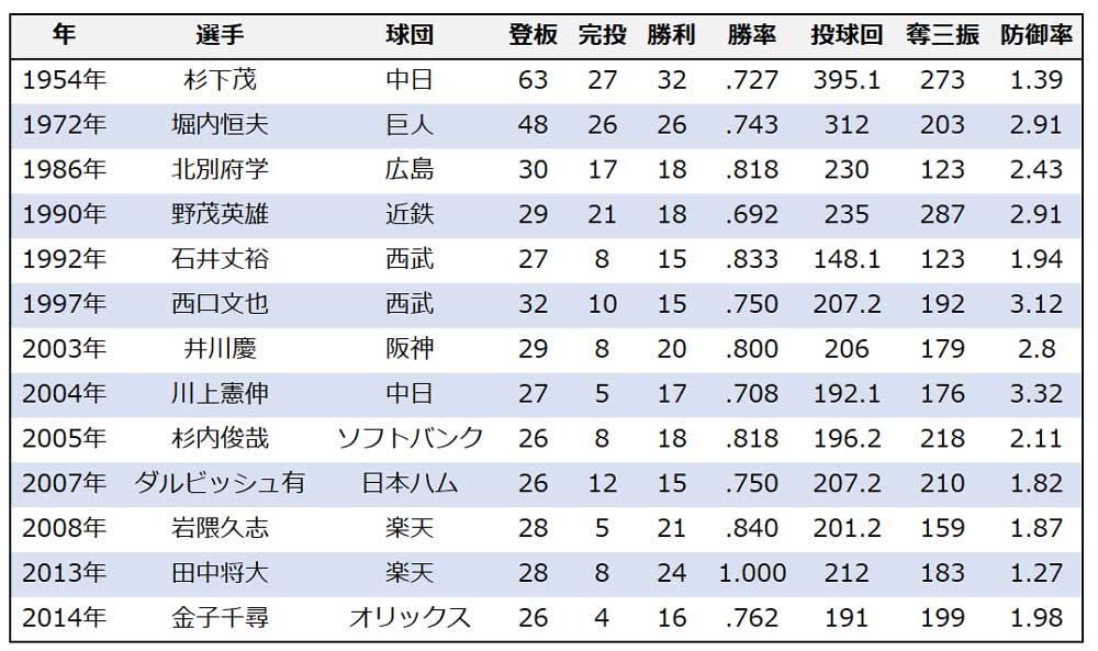これまでにMVPと沢村賞を同時受賞した選手一覧