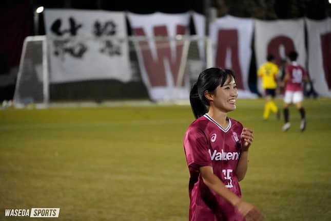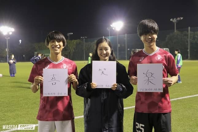 高原 先ほど、ア式で一番楽しかった瞬間はいつですかという質問がありましたが、楽しかった思い出はいくつもあったのですが、その中に4年早慶戦が私はあって。普通ないじゃないですが。マネージャーでしかもサッカー経験も全くなくて。少しの時間でもああやって出してもらえるって本当に幸せだなって。ユニフォームを着られるだけでもすごくうれしかったんですけど、まさか自分がピッチに立つなんて。本当に前日まで出るって思っていなかったですし、だからすごくうれしかったですね。それに、向こうのストレート側…