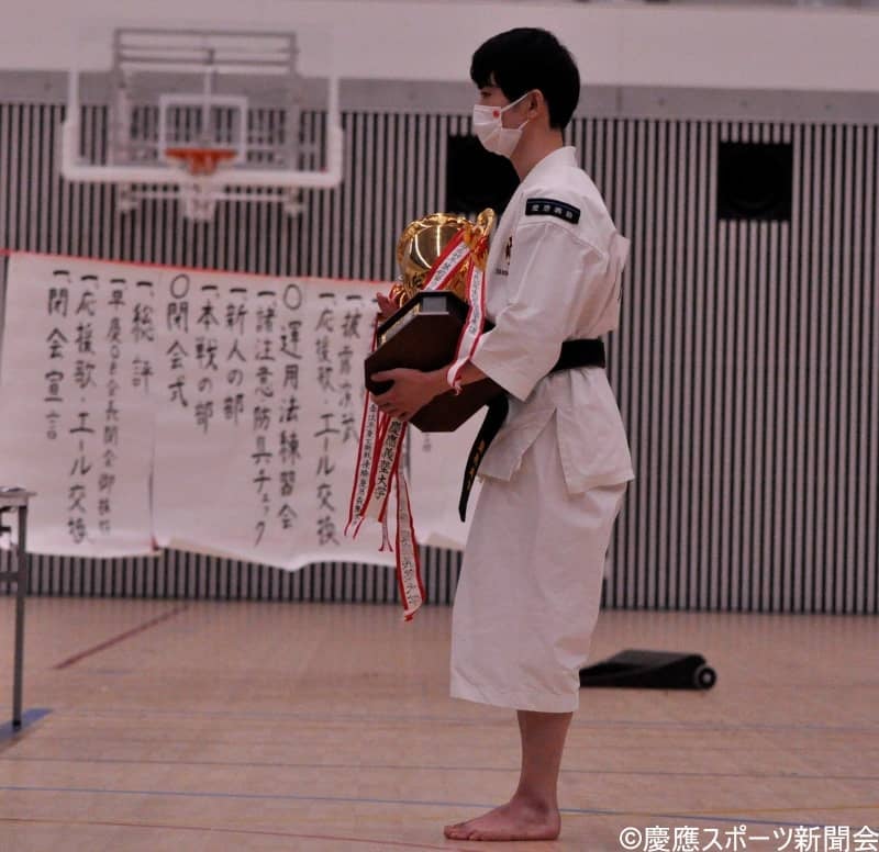 二年続けて大将として優勝杯を手にした多田5日、日吉記念館にて少林寺拳法の早慶戦が行われた。例年は新体制の船出となる今大会だが、今年は4年生までの全学年が出場し栄冠を争った。本戦の部では早慶戦初出場となる佐藤生一(文2・日大豊山)が逆転勝利で勢いをもたらすと、山内嶺央(経3・西大和学園)、西山航生(文3・厚木)もそれに続き、優位に試合を運ぶ。最後は大将・多田光伯(商4・逗子開成)が圧巻の立合で快勝し、見事慶大が二年連続の早慶戦勝利を果たした。